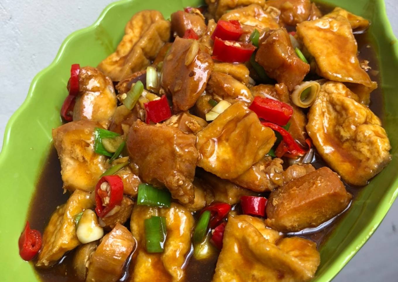 - Tumis bumbu cincang hingga kecoklatan,masukan saus tiram,kecap,air maizena kemudian masukan ayam & tahu yg sdh digoreng