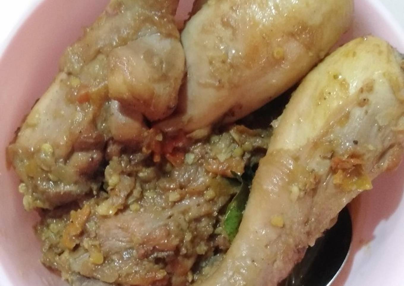 - Haluskan semua bumbu-bumbu, kemudian tumis sampai baunya harum dan tambahkan sedikit air, kemudian masukkan ayam yang sudah digoreng tadi.
