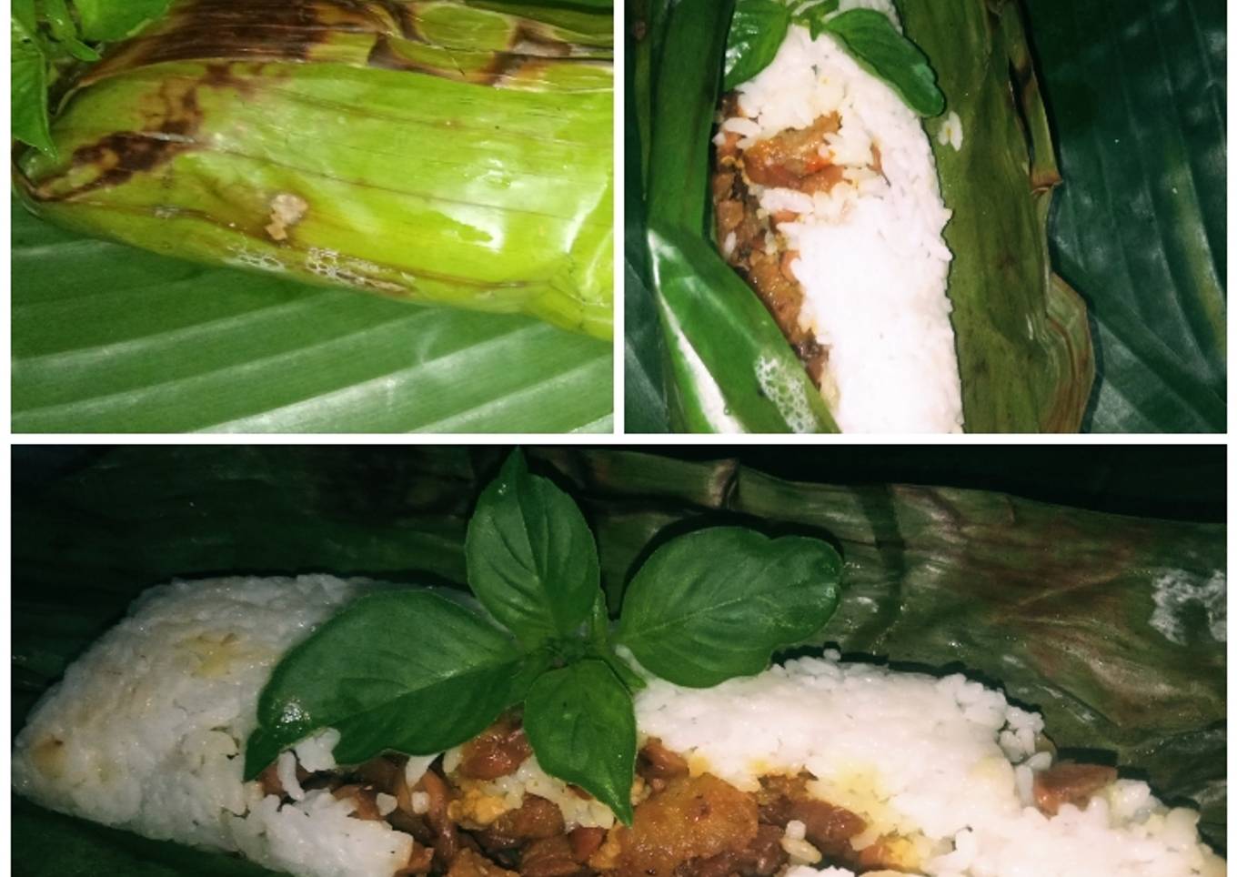 - Lap daun pisang sampai bersih, letakkan nasi dulu kemudian lauknya tadi. Gulung dan bungkus dengan rapi.