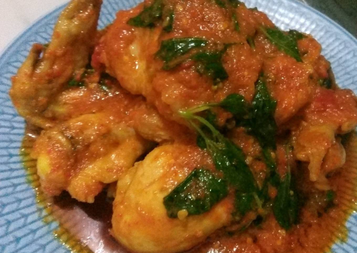 - Setelah air mendidih masukkan ayam, diamkan sesekali diaduk sampai bumbu meresap. masukkan kemangi, cicipi rasa