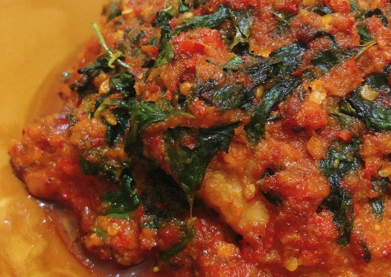 - Masukan ayam yg sudah digoreng dan tambahkan sedikit air lalu masukan kemangi. Masak hingga air menyusut.