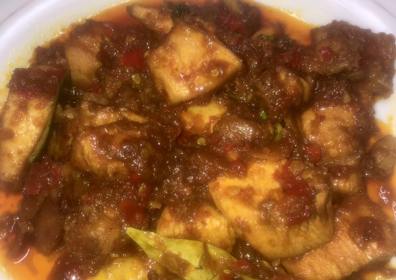 - Tumis bumbu halus, tambahkan sereh daun jeruk dan daun salam, tumis hingga harum tambahkan air 50ml, tambahkan garam dan penyedap, koreksi rasa, tunggu mendidih masukan daging ayam yg sdh di goreng