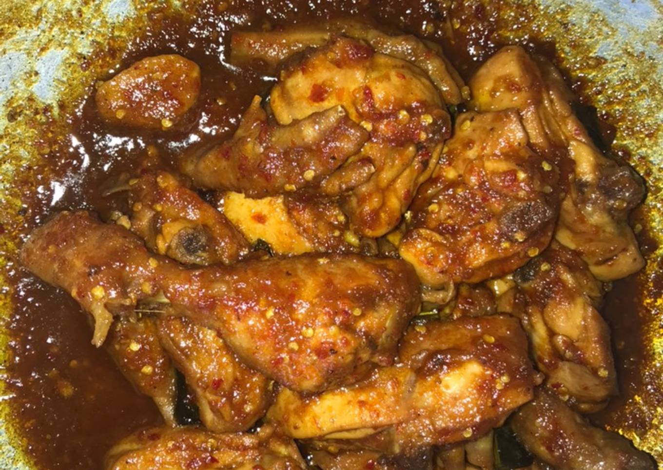 - Tumis semua bumbu beri air secukupnya tambahakan lada gula dan kecap, masukan ayam, ungkep hingga air menyusut dan ayam empuk