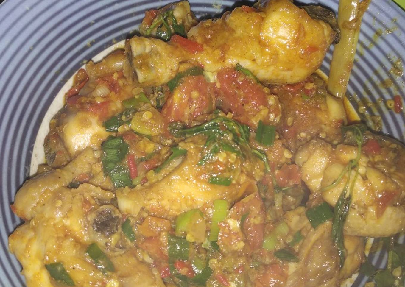 - Haluskan semua bumbu halus,lalu tumis beserta laos,tomat dan serai dan masukkan ayam aduk sampai meresap.