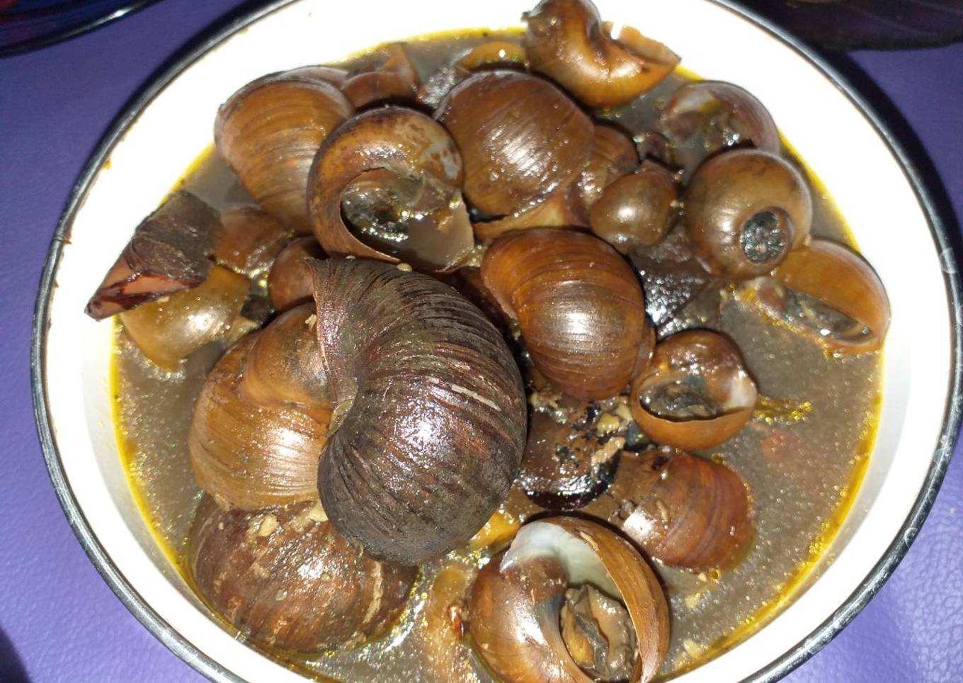 - Rendam keong semalaman penuh untuk menghilangkan bau tanah, setelah di rendam semalaman di bersihkan keongnya dan di buang bagian belakangnya yang lancip
